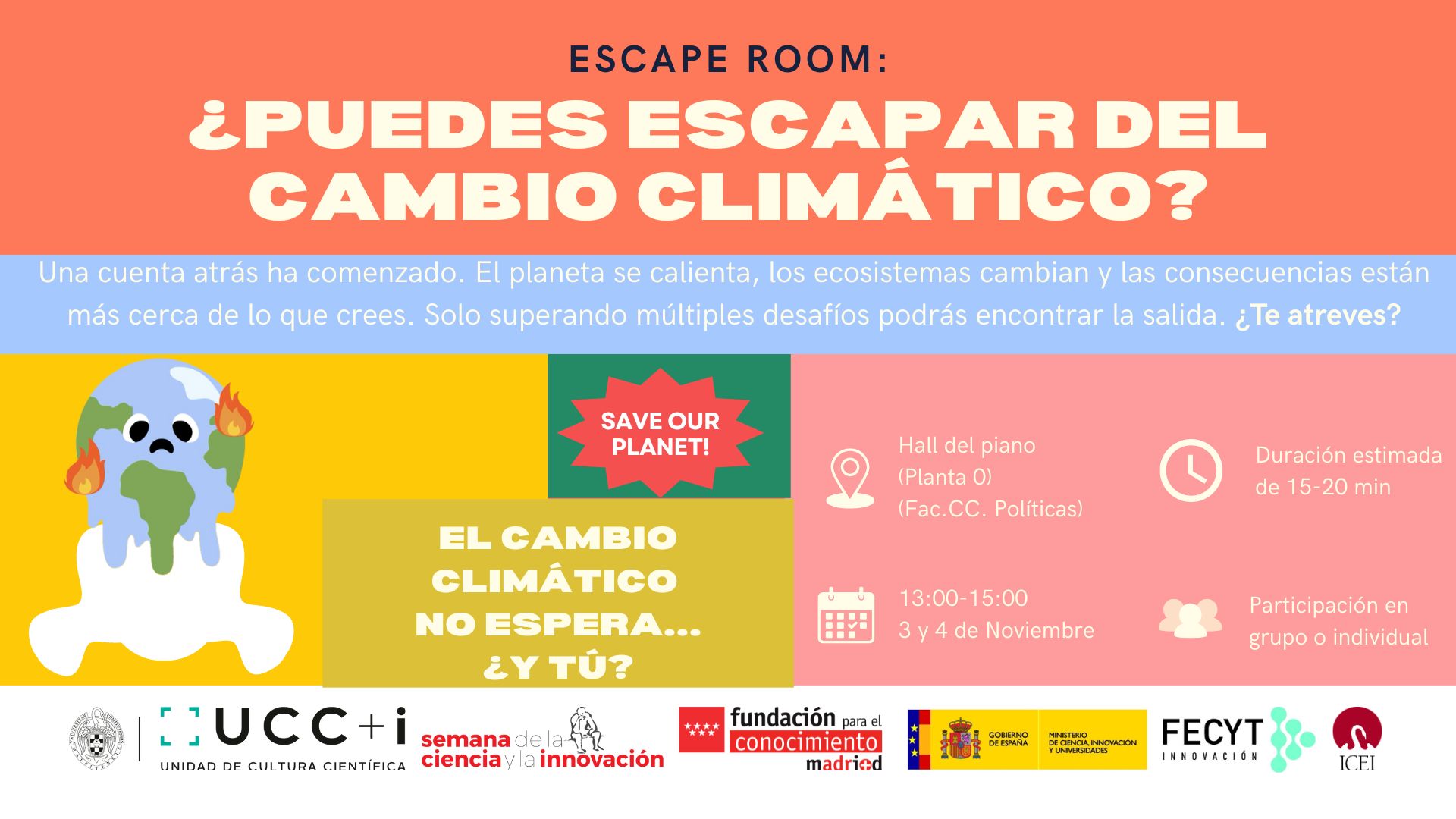 ¿Puedes escapar del cambio climático? Ven a nuestra Escape Room a intentar resolver múltiples desafíos: candados, pistas escondidas, cuadernos mágicos y rompecabezas imposibles. ¡Ven y demuestra todo lo que sabes sobre cómo el cambio climático impacta en nuestra seguridad humana! ¿Serás capaz de conseguir tu pasaporte para salvarte? (3 y 4 noviembre, de 13 a 15.00hrs, al lado del piano)