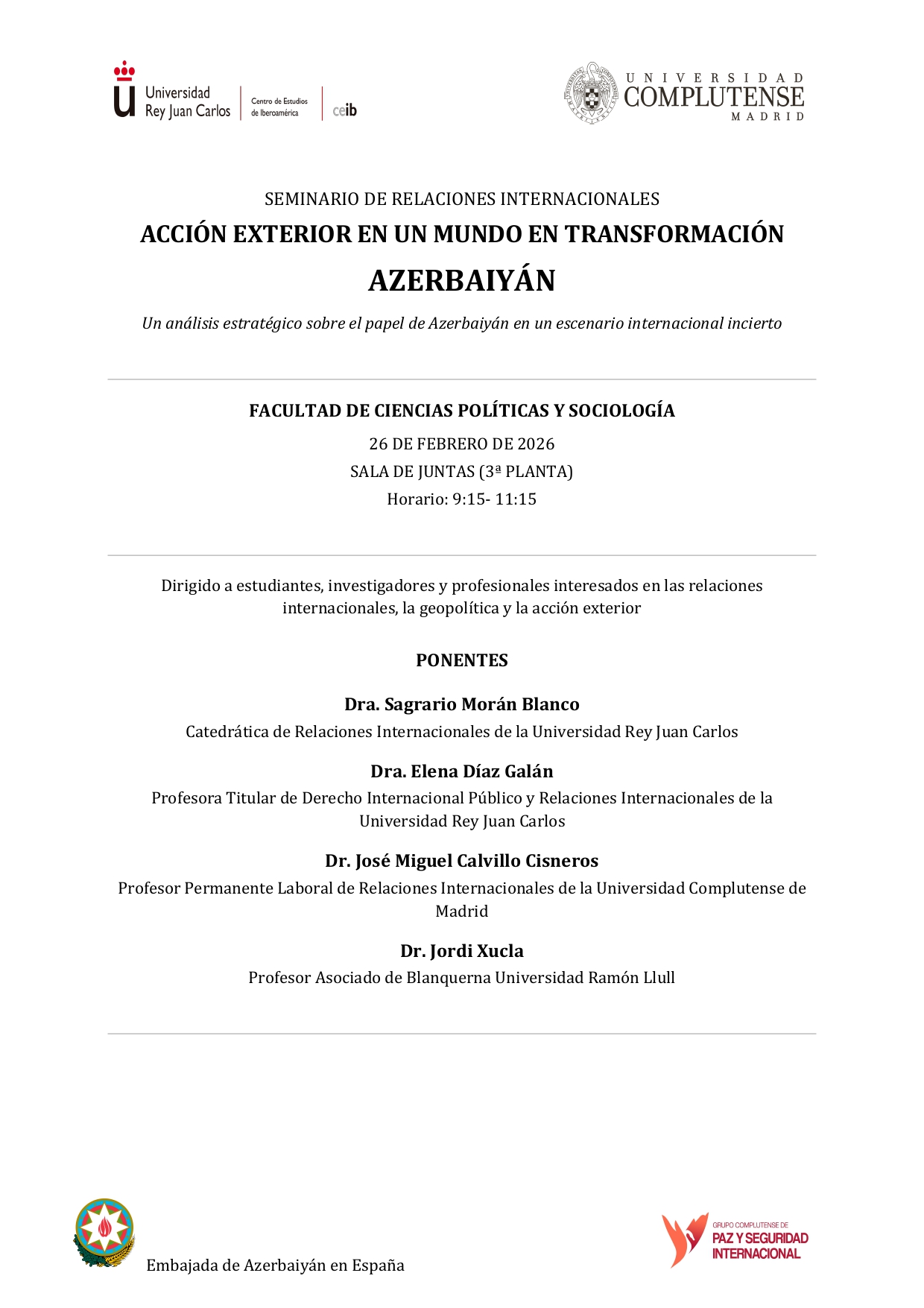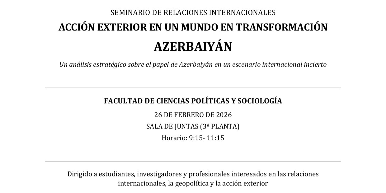Seminario de Relaciones Internacionales sobre acción exterior: Azerbaiyán en un mundo en transformación: Agenda de paz, política regional y global" Fac. de Ciencias Políticas y Sociología de la UCM. 26 de febrero de 2026. 9:00 a 11:00. Sala de Juntas (3ª planta)