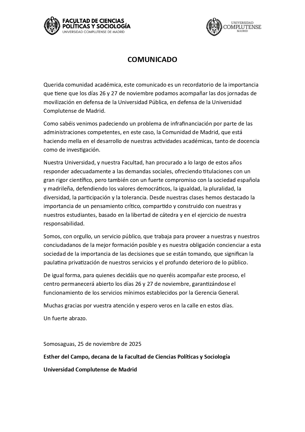 Querida comunidad académica, este comunicado es un recordatorio de la importancia que tiene que los días 26 y 27 de noviembre podamos acompañar las dos jornadas de movilización en defensa de la Universidad Pública, en defensa de la Universidad Complutense de Madrid.