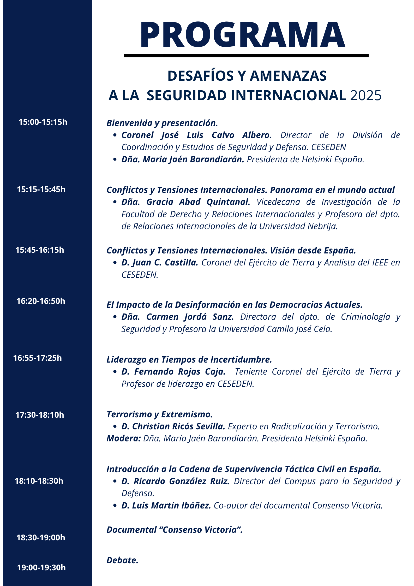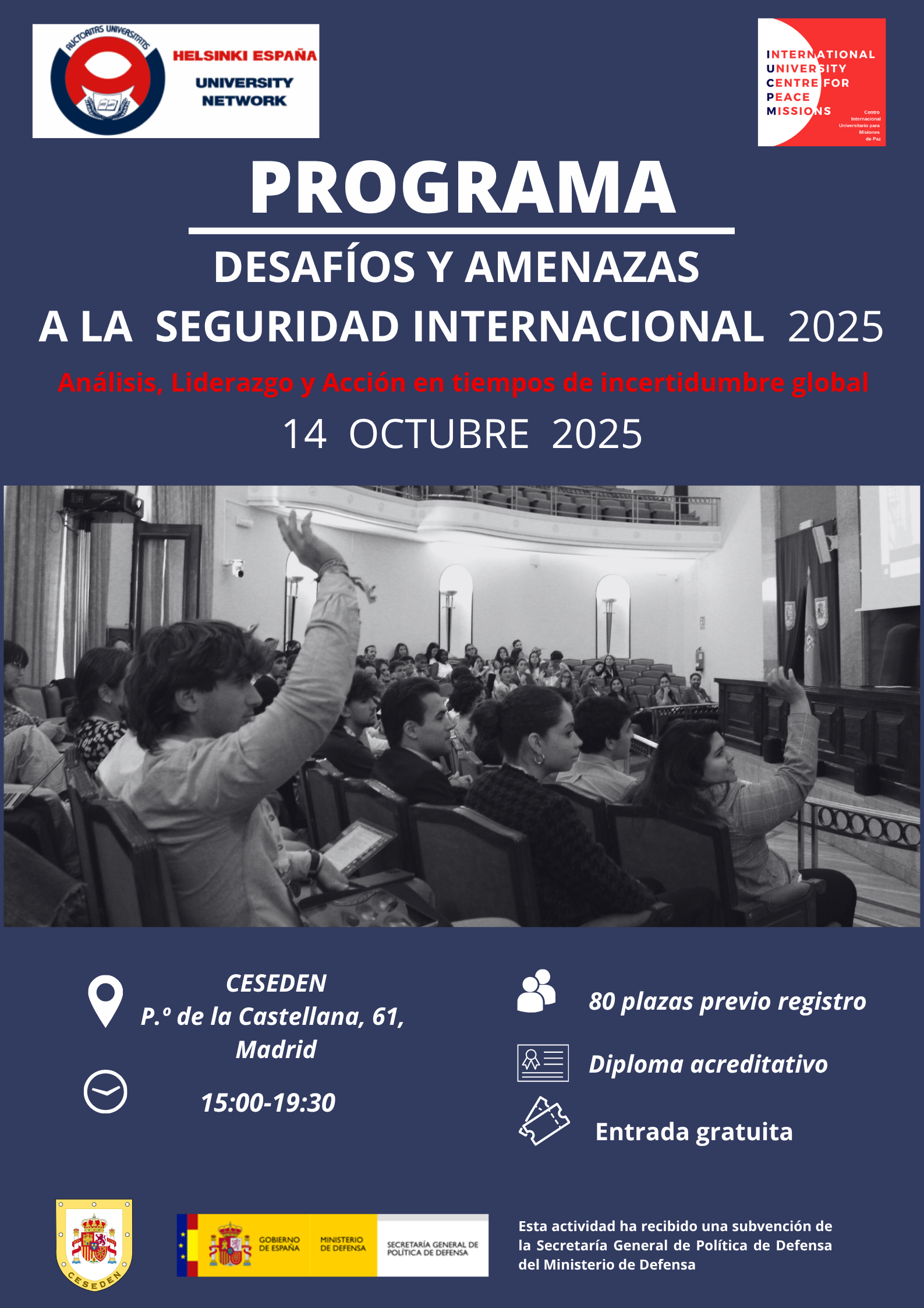 El 14 de octubre de 2025 tendrá lugar en el CESEDEN (Madrid) el seminario Desafíos y Amenazas a la Seguridad Internacional. Con la participación de expertos del ámbito académico y de la defensa, se abordarán cuestiones clave como conflictos internacionales, desinformación, terrorismo y liderazgo en entornos de incertidumbre. Actividad gratuita, con diploma acreditativo y aforo limitado a 80 plazas.