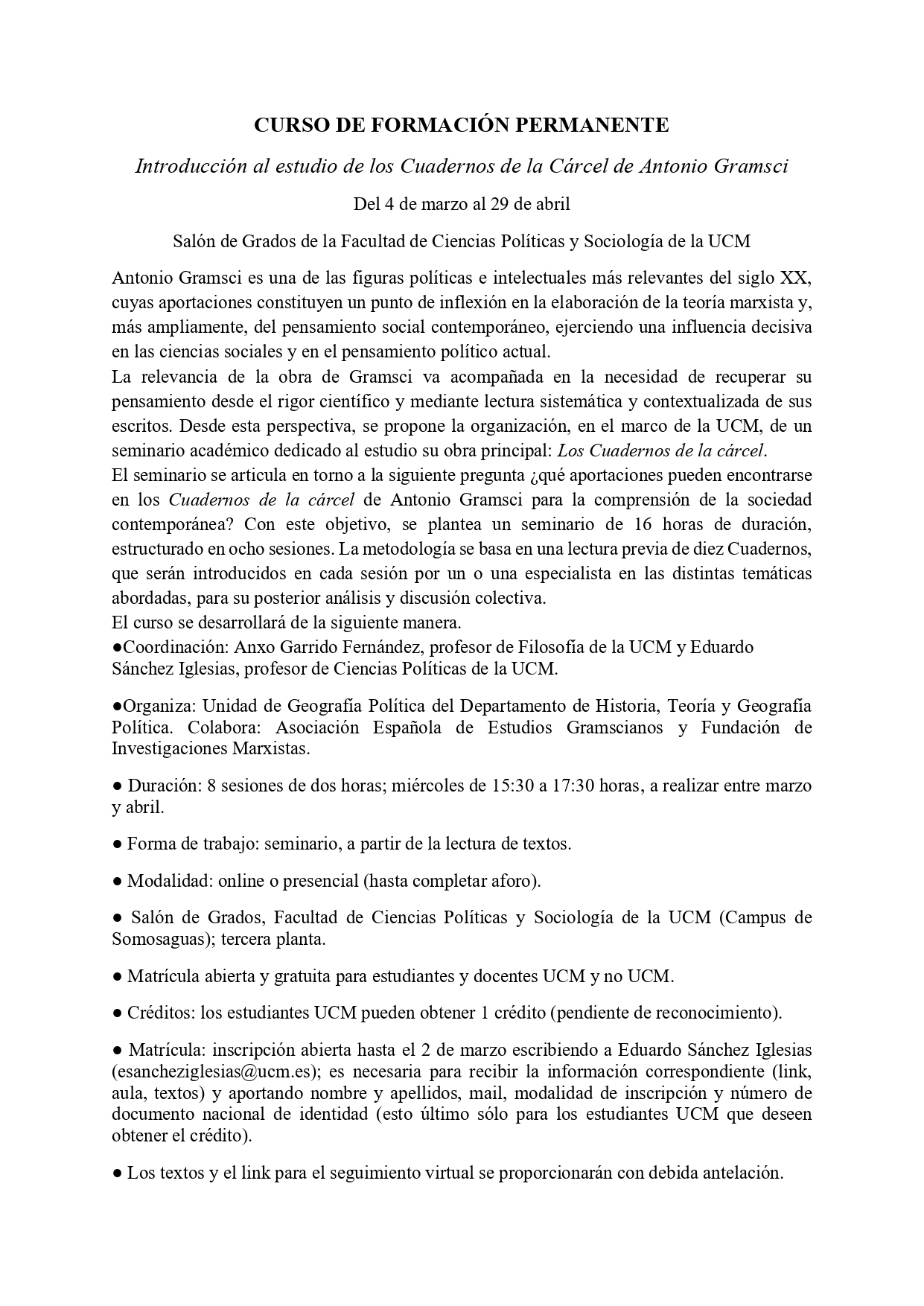 • Matrícula: inscripción abierta hasta el 2 de marzo escribiendo a Eduardo Sánchez Iglesias (esancheziglesias@ucm.es).