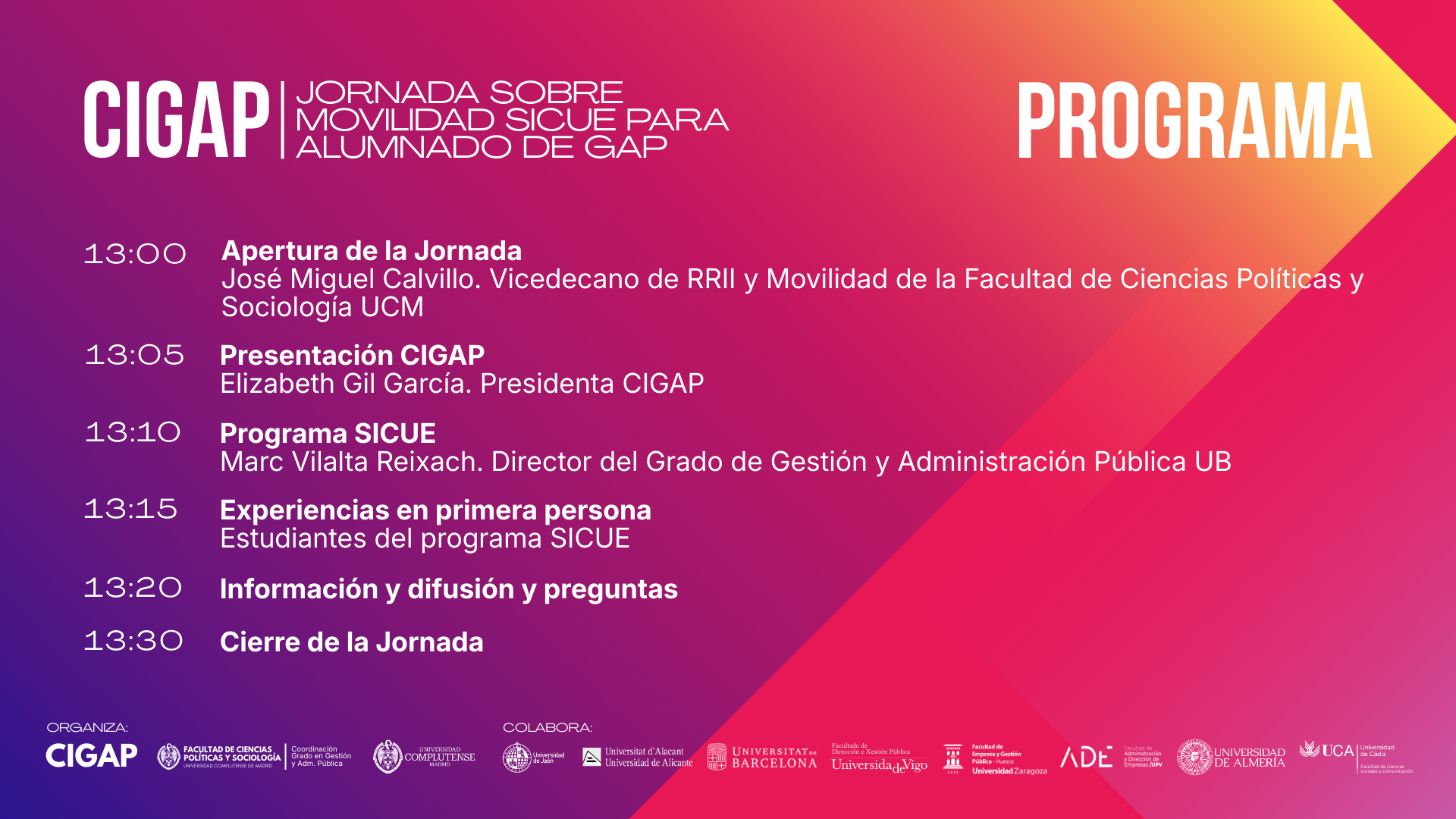 El martes 27 de enero tendrá lugar una Jornada sobre la movilidad SICUE para estudiantes de GAP. Organizada por CIGAP (Conferencia Interuniversitaria de Grados en GAP) y la coordinación de nuestro grado, se tratarán todos los aspectos más importantes sobre la movilidad SICUE, con todos los destinos disponibles por el territorio y otras cuestiones.