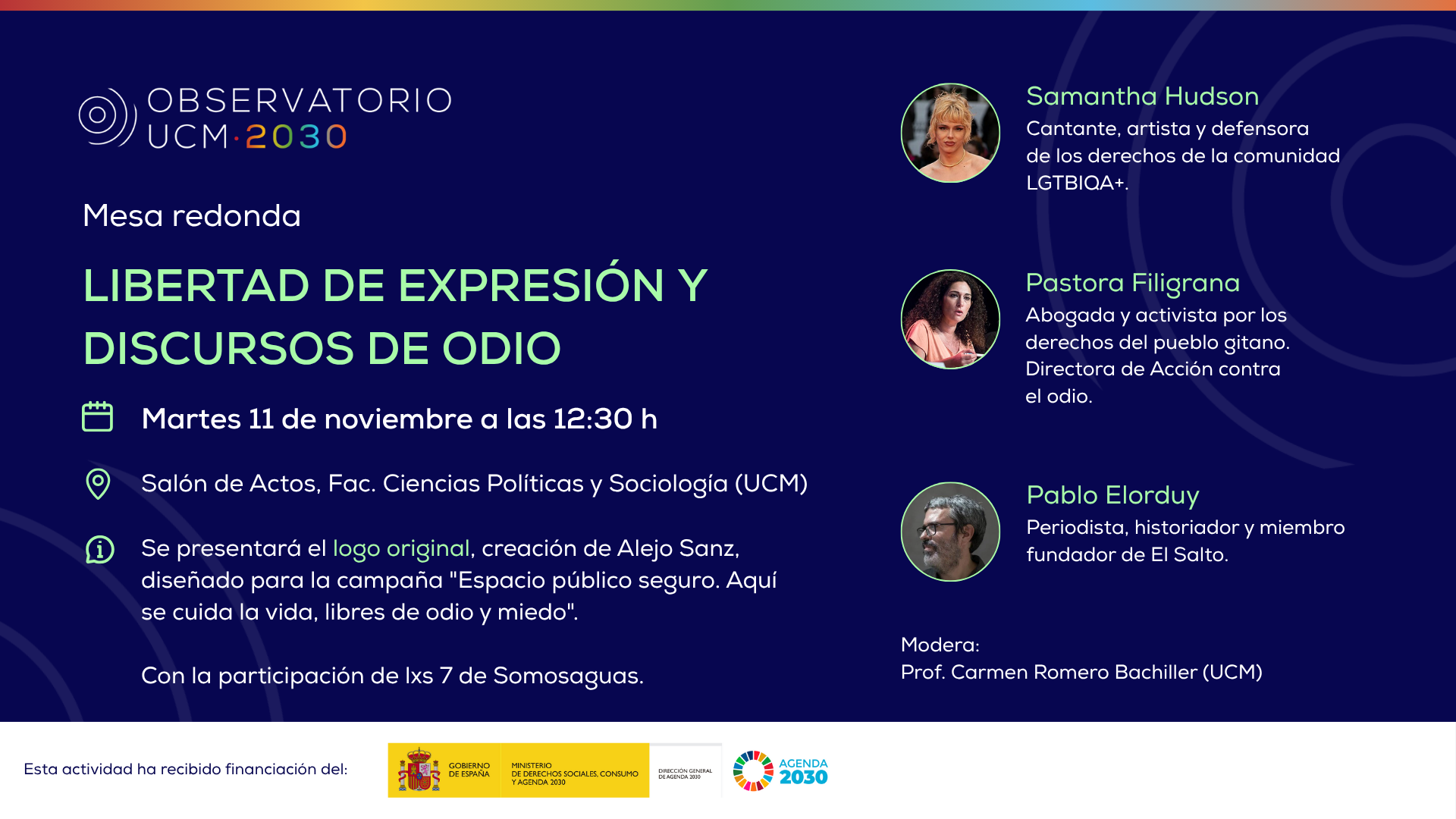 El próximo martes 11 de noviembre a las 12.30 hs. se celebrará una mesa redonda sobre libertad de expresión y discursos de odio en el Salón de actos de nuestra Facultad. El acto estará moderado por Carmen Romero Bachiller y contará con la presencia de la artista y cantante Samantha Hudson, el periodista e historiador Pablo Elorduy y la abogada y directora de Acción contra el odio, Pastora Filigrana.