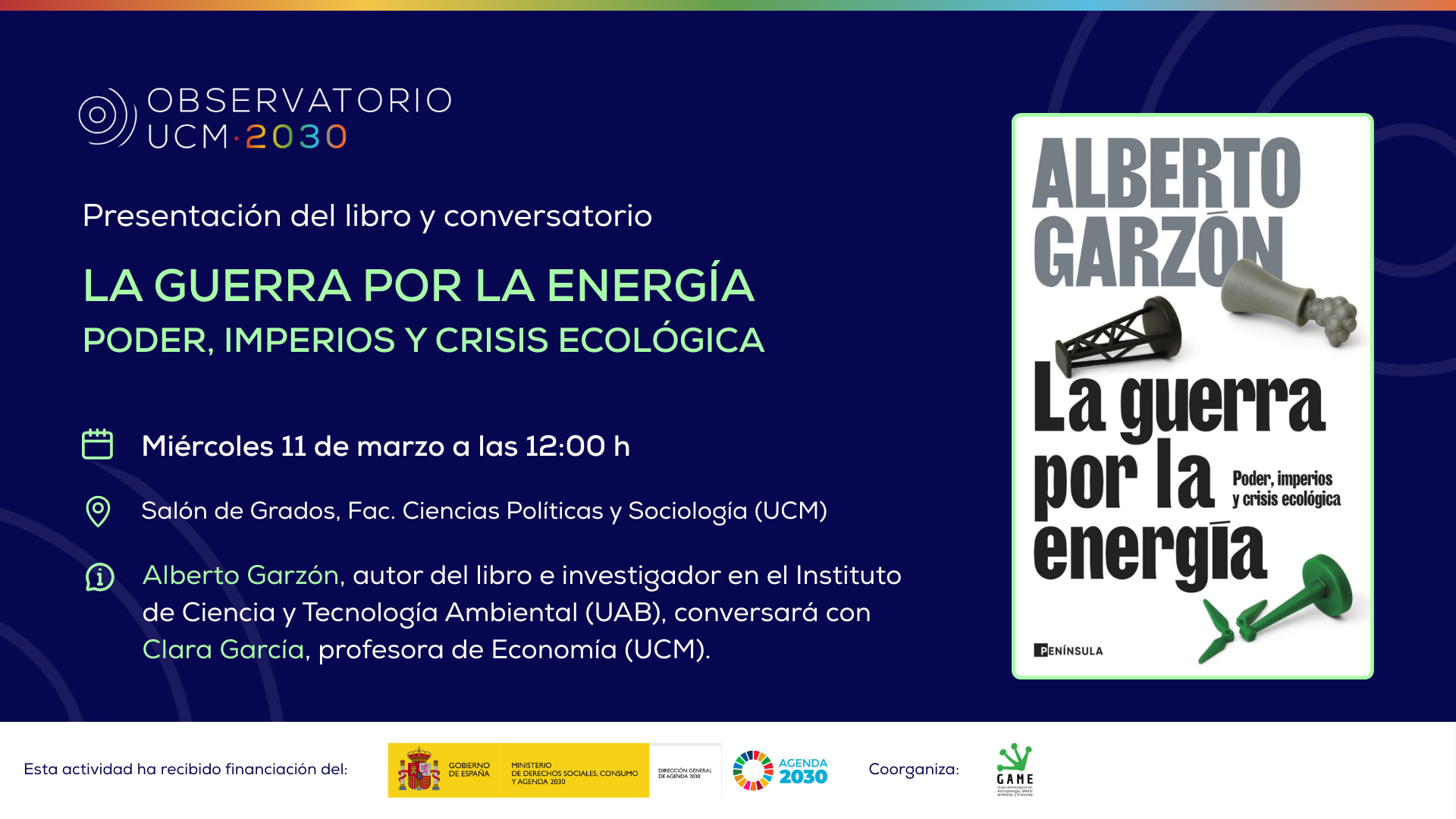 El miércoles 11 de marzo a las 12 hs., en el Salón de Grados de la Facultad de Ciencias Políticas y Sociología de la UCM, Alberto Garzón presentará su último libro, La guerra por la energía (Península, 2026), junto a Clara García, profesora de Economía en la UCM, quien comentará la obra. El acto está organizado por el Observatorio UCM 2030 y por el grupo de investigación de la Facultad GAME (Grupo de investigación en Antropología, Medio ambiente y Economía).