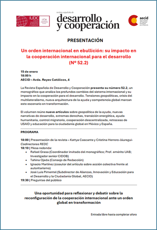 La Revista Española de Desarrollo y Cooperación (REDC) presentará el próximo 15 de enero, a las 18:00 horas en la AECID, su número 52.2, un monográfico que aborda los profundos cambios que vive el sistema internacional y su impacto directo en la cooperación para el desarrollo. Bajo el título “Un orden internacional en ebullición: su impacto en la cooperación internacional para el desarrollo”, este volumen analiza un escenario global marcado por tensiones geopolíticas, retrocesos en el multilateralismo y transformaciones aceleradas en la arquitectura de la ayuda.
